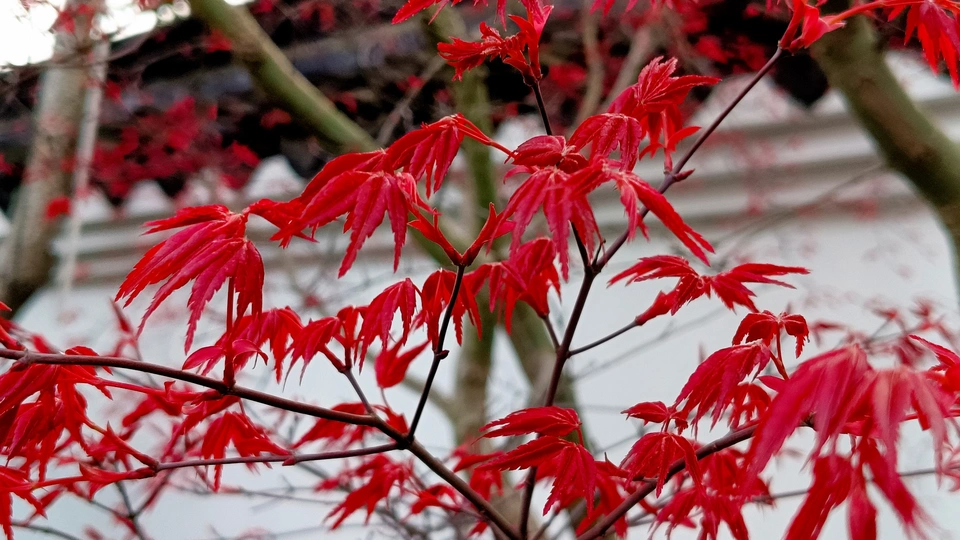 这张照片展示了一棵红色的枫树,树叶在阳光的照耀下显得格外鲜艳。树干笔直而粗壮,树枝伸展出去,形成了一个茂密的树冠。