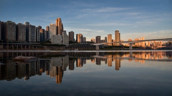 在日出前的一小时被闹钟叫醒,在日出前的一刻钟来到江边的机位,架好机器,静候日出。在小程序计算出的日出时间后的十多分钟,太阳才从南山升起,用金光把城市的建筑依次照亮。此时黎明前的蓝色正好与被照亮的建筑的金色形成鲜明的对比。风也停下了,江边有漂亮的倒影。新的一天就这样开始了。