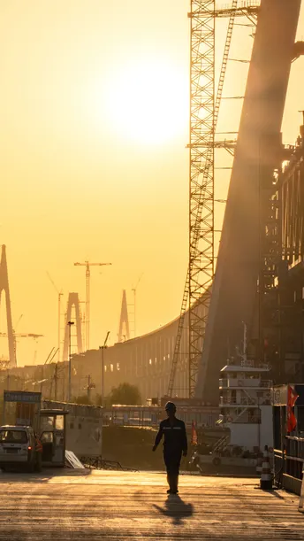 夕阳西下,工程建设者忙碌了一天下班了,累却很充实。