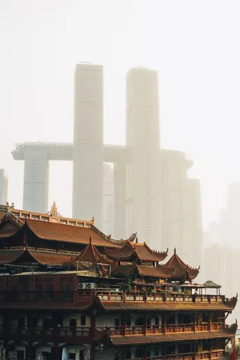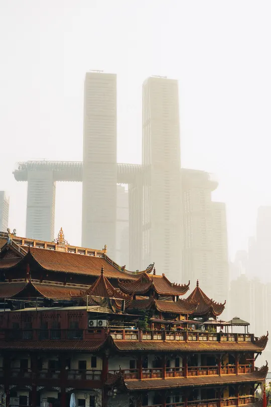 山城不止夜晚才迷人,日落的重庆古今魔幻对比,巨大的来福士犹如海市蜃楼矗立在千佛山后方 📍重庆喜马拉雅 📸索尼a7r2 腾龙70-180
