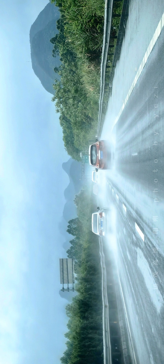 高速路上飞弛的汽车在雨天中,仿佛置身于巨型柔光罩中,整个画面远,中,近景,让画面层次分明,汽车飞驰溅起的水花,让人感受到飞驰的车速。