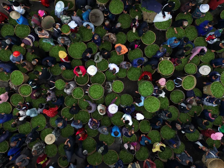 清明时节的雅安红星镇春茶交易市场,一框框装满嫩叶的背篼,人头攒动,热火朝天,茶香四溢!