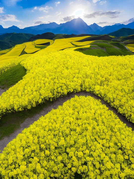 不同于其他花卉的娇艳,油菜花以其朴素而纯粹的金黄色调,占据了田野的每一个角落。她们如同无数的小太阳,散发出温暖而明亮的光芒,将整个春天都染上了金色的色彩。在微风的吹拂下,油菜花轻轻摇曳,仿佛是大自然在弹奏一曲优美的田园交响曲。