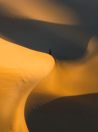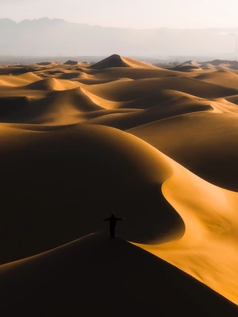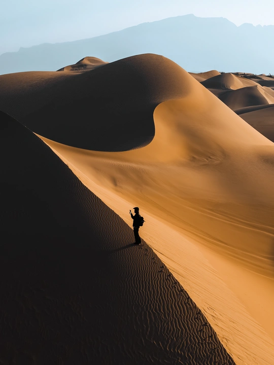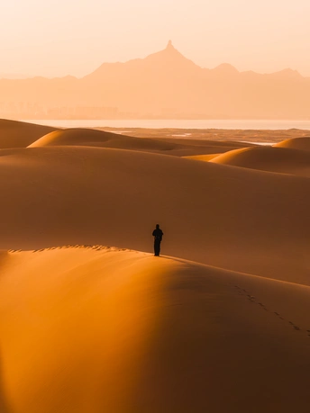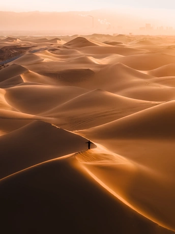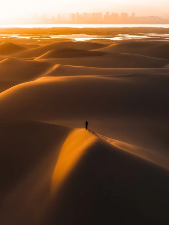 拍摄于内蒙古乌海的沙漠 离城市不远的地方就是连绵不绝的沙漠 日出之前赶往这里,徒步爬上一座沙丘之上正好太阳升起,远处是朦胧的城市建筑群,乌海湖泛着白光,而沙漠像是海浪一样一层叠着一层,此刻我感受到大自然的震撼~