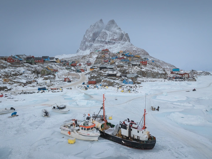 往返两万公里,在北极抓住了冬天的尾巴! 这里是格陵兰岛乌玛纳克镇,附近的大海12月-4月属于结冰期,渔船全都冻在港口之中。 狗拉雪橇和雪地摩托,此时成为了渔民们在海冰上往来捕鱼点的交通方式,鳕鱼、比目鱼是当地人捕捞的主要鱼类。 摄影师本人我也出现在了这张照片中,大家能看到吗