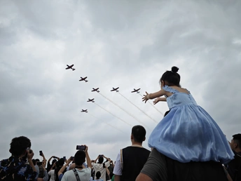 长春航展上, 女孩伏于爷爷的肩膀, 随着飞机的渐行渐近而欢呼雀跃!