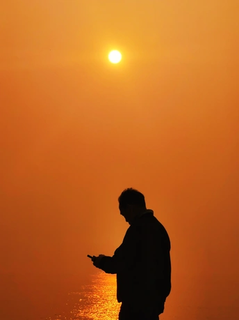 久违的海上日出,拍完日出准备返回,见在堤坝上站着一航拍者,于是抓拍其剪影。