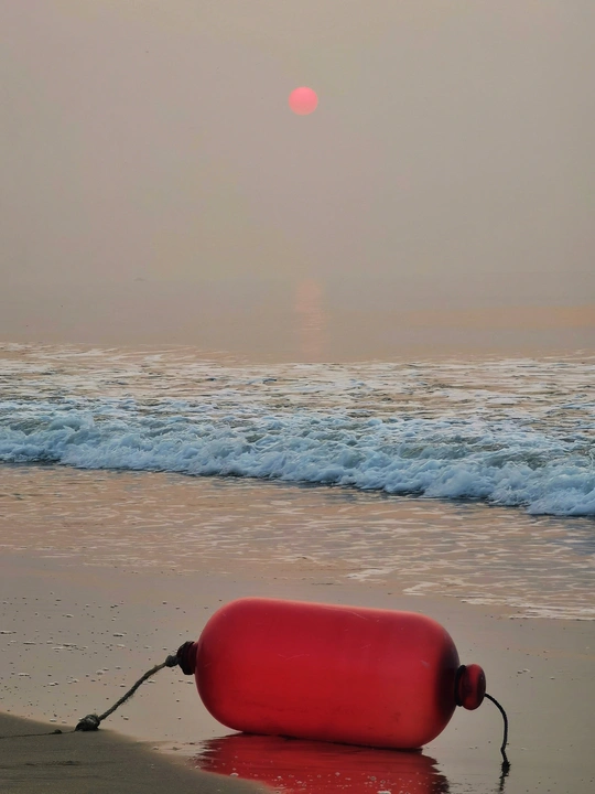 雾天日出,红日显出,微光照在海面上。利用红色浮标作为前景,构成一幅海上日出。