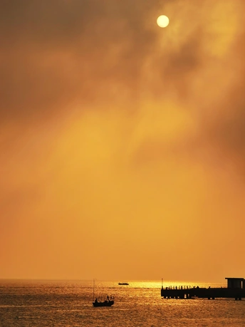 中国唯一市区拥有内海湾的城市。 春天早晚有雾。临近夕阳落山时,天空云层越来越多,夕阳时隐时现,从云隙透射出一撮光,照亮海面。