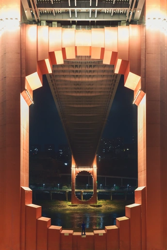 这是重庆红岩村大桥的桥墩,色彩选用赭红色,取自于页岩的天然本色,也就是附近的岩石的色彩,既体现了源于大自然的属性,又能让桥塔的形象变得更加鲜明,彰显庄重典雅的形象。桥墩的造型像一个巨大的窗口,目光越过这个窗口,可以看到对岸的城市风貌,庄严、大气。
