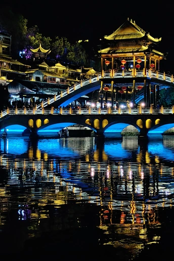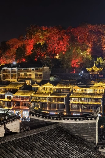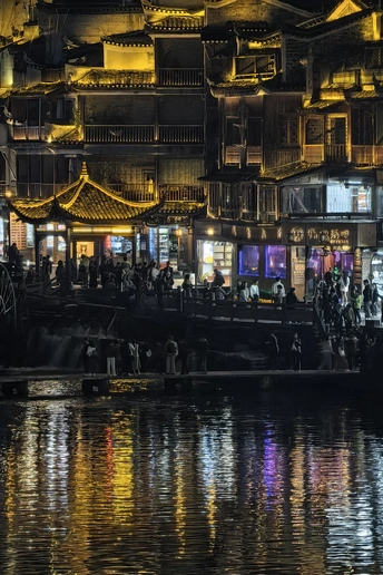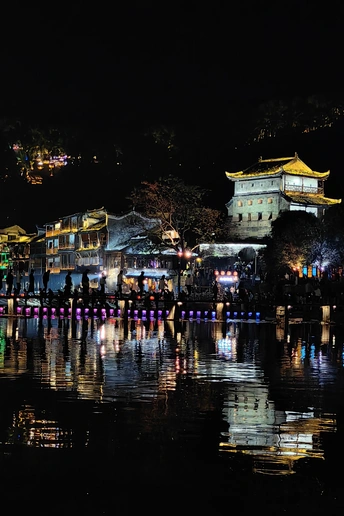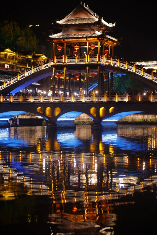 夜色中的古城,华灯初上,沿沱江两岸的吊脚楼灯火通明,倒映在平静的江面上,宛如一幅美丽的水墨画卷。漫步在古城的石板街道上,两旁的古建筑散发着迷人的光彩,仿佛穿越时空,回到了千年前的繁华盛景。
