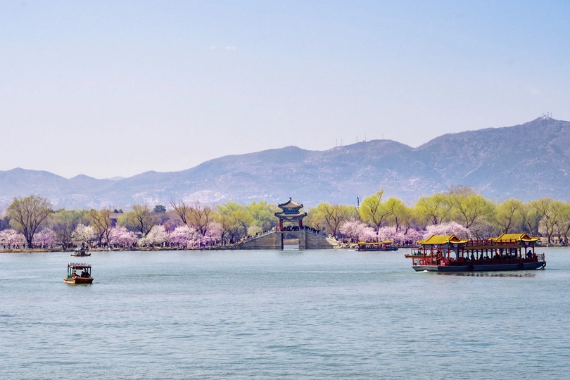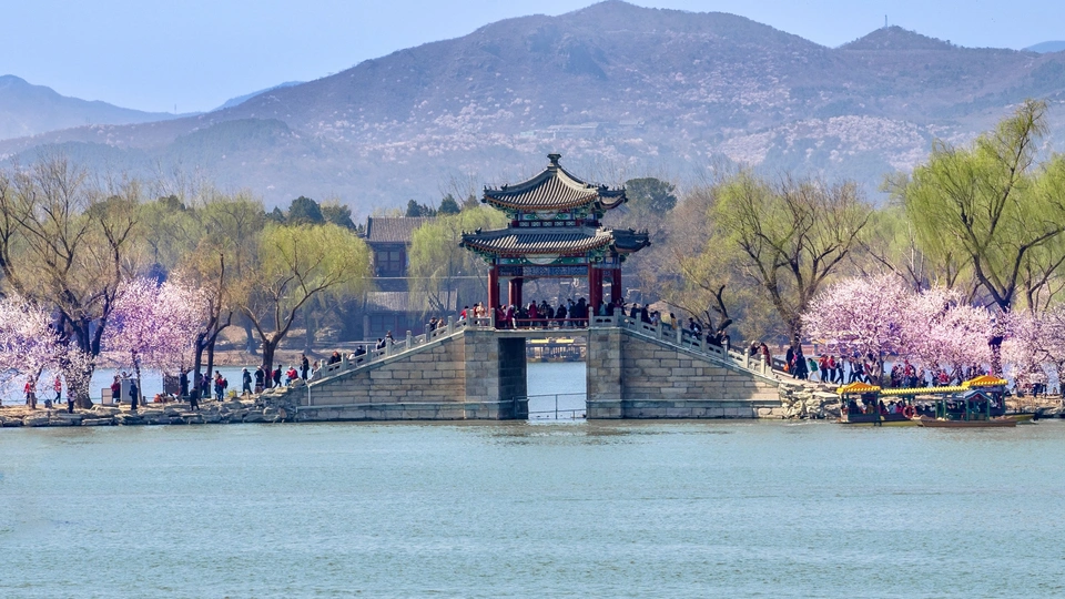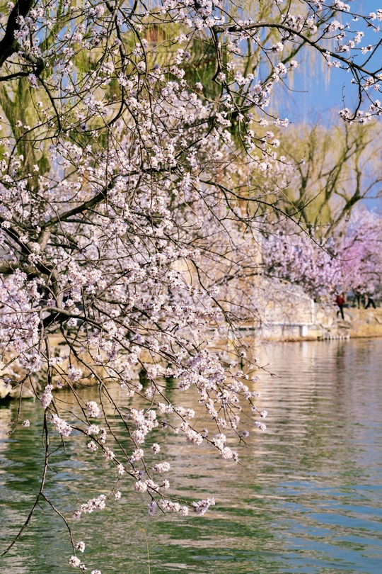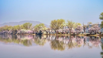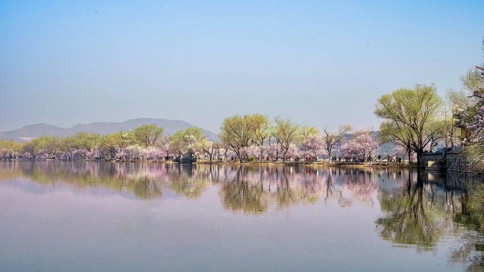 春回大地 颐和园西堤百余株山桃次第绽放 每一眼都让人沉醉 一场春风过吹开冰封的湖面 也唤醒枝头的花苞 颐和园的春天里 有花颜的千柔百媚 有属于三月的仪态万千沿着西堤 漫步桃柳之间这是初春的鲜嫩色彩含羞待放,生机盎然。 西堤山桃花沿着西堤绵延探入昆明湖,深粉、浅粉、桃粉等花枝与湖光山色、塔影桥韵交织。 身临其中,在花枝间远眺佛香阁和十七孔桥,花影在身边交错,身处春意盎然的美景之中,人在花中游,人在画中游。