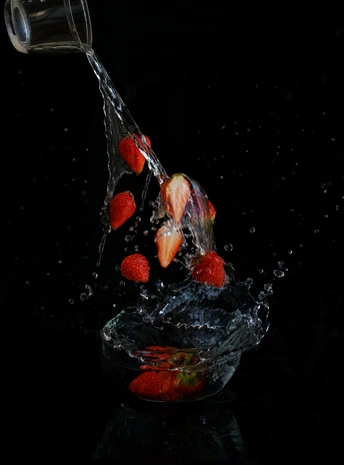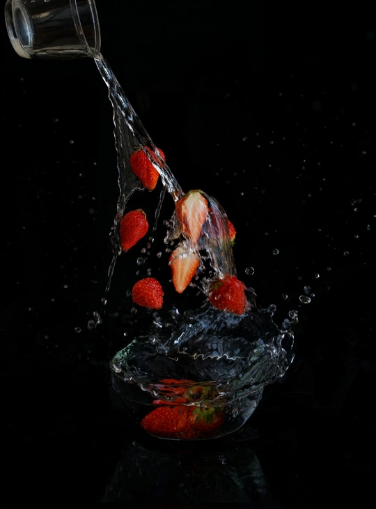 创意静物拍摄,悬浮飞溅草莓。