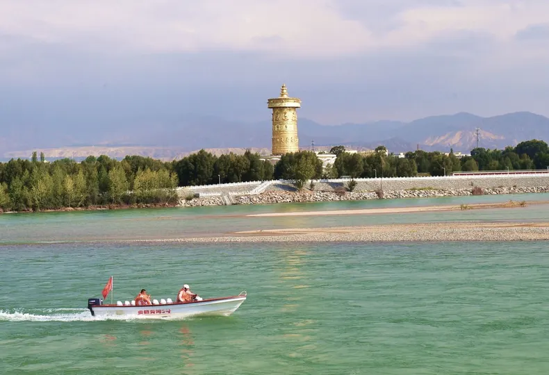 在青海省贵德县境内的黄河,宽阔清澈,缓缓地穿城而过。完全颠覆了你印象中对黄河的认知。一时间让人转不过弯来!河边是世界上最大的转经轮“中华福运轮”。