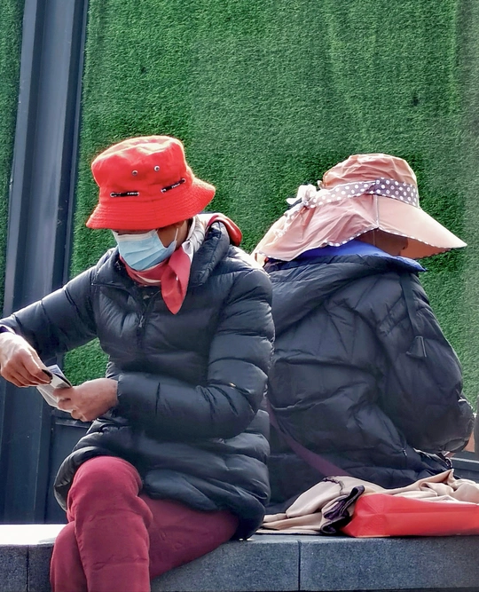 冬日衔头,阳光下老人训聚在一起打着扑克,头上的帽子有特色