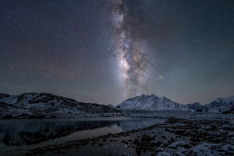 西藏珠峰东坡,银河如练,星光璀璨。夜幕低垂,星河倾泻,映照着巍峨的雪山,仿佛天地相接,美轮美奂。仰望苍穹,银河如一条璀璨的河流,流淌在无尽的夜空,令人心醉神迷,仿佛置身于梦幻般的仙境之中。