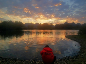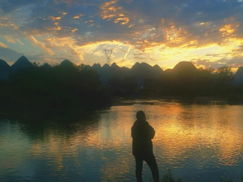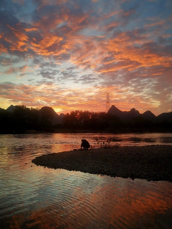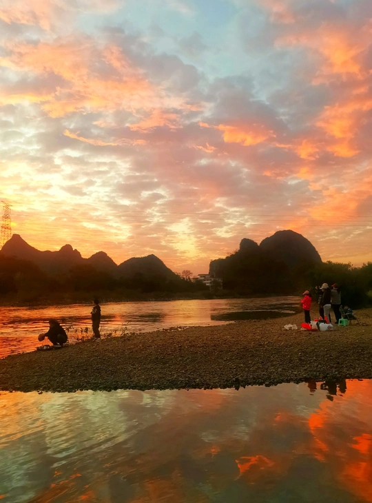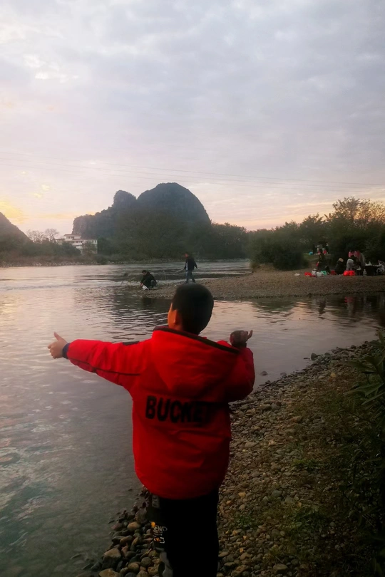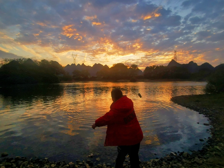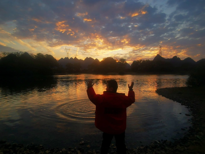 犹记得2023年平安夜那一天,在漓江边郊游野炊,落日后准备返程,天边突然开始烧了起来!第一次在江边看到如此壮观的火烧云,于是把漓江美景与这满天霞光拍了下来!宝贝的红色外套在金色霞光中充满了活力,借此留念!