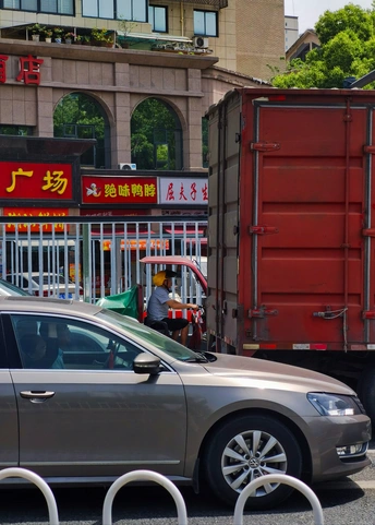 街头观车流,招牌上的广场,车道上的卡车,轿车,摩托夹在一起。摩托骑手被挤在车流中,仅可见黄色头盔,这就是我们日常生活的空间啦……