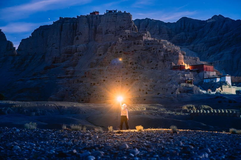 古格王朝深夜,独自一人在遗址对面的荒野上露营,只为了记录远古星空下的古代遗迹