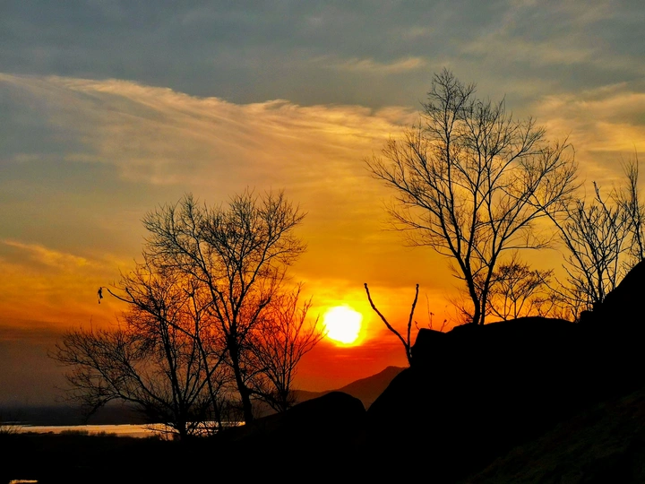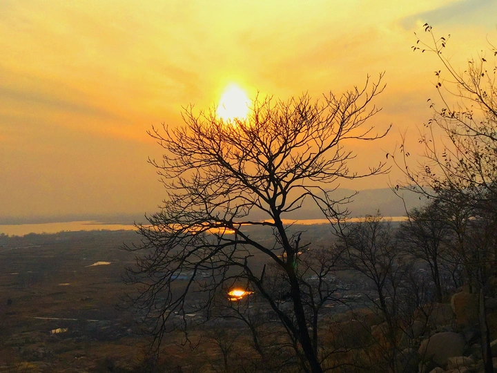 利用视觉错位,橘子般的夕阳就像悬挂于树梢之上,怀抱于孤树之间