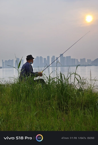 在午后时分,虽然天气不太好,但还是隐隐约约出来了太阳,在江边看到钓鱼者,通过视差,抓拍,钓鱼竿钓到了太阳