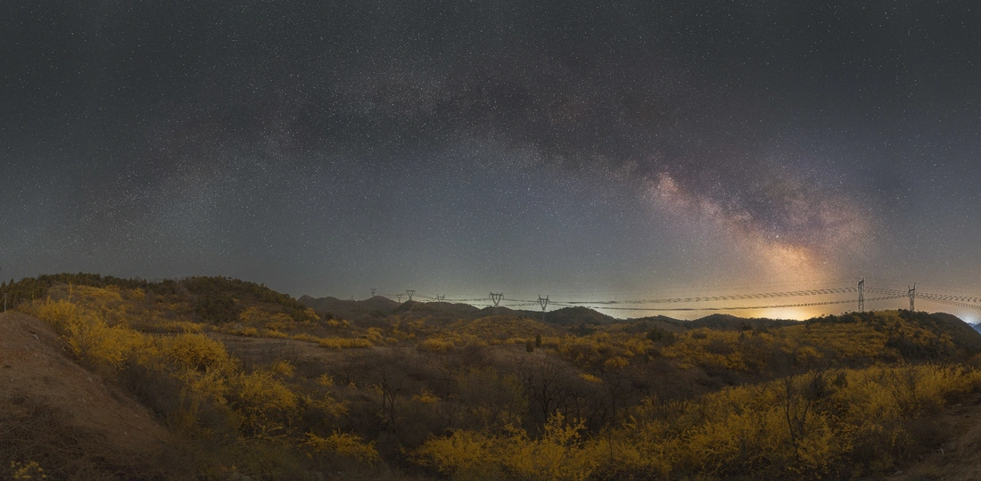 在蓟州的一处山谷内每年4月份就会有满山遍野的连翘花,提前规划好机位,查好天气,找了一个合适的夜晚,后半夜等待银河拱桥慢慢升起,拍下了银河下的连翘花。 设备:索尼A7R3、索尼G35F1.4、徕图三脚架 ISO:4000、快门:6秒、光圈:F1.4 2排16组共计80张