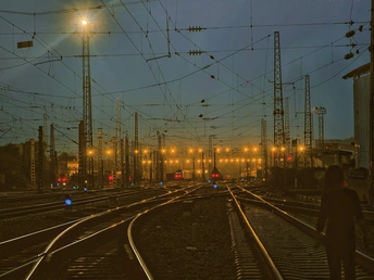 晚间, 铁路的一瞥, 群星闪耀; 在那银白线条, 线在天边织网, 蓝色的信号灯和红色的火车灯, 还有那高高悬的, 或是并两排,照明灯; 似在等候, 或者见证; 夜幕下, 地上长出的星光, 交织着一团, 与这忙忙碌碌的城市与人们一起, 或涨或熄……