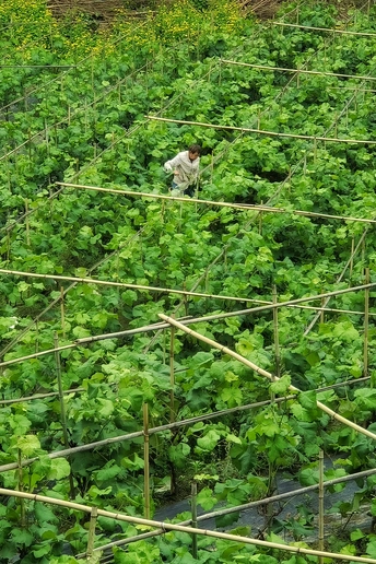 爬山路过一片葡萄园,葡萄架子形成框架,人物在中间很显眼,杂乱中又有一种次序。