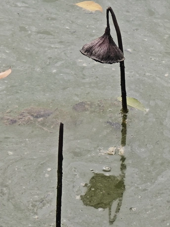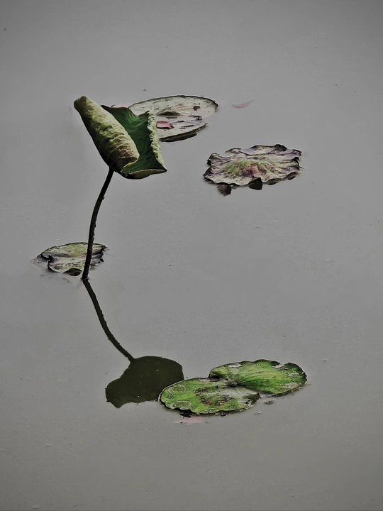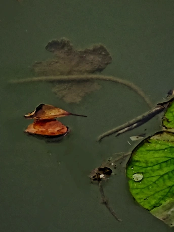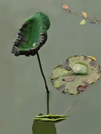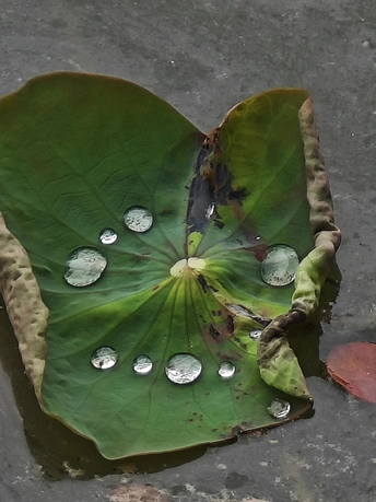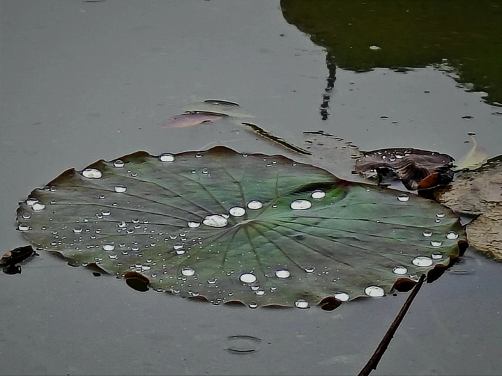 雨后的西山荷塘,几片残页上星罗棋布的水珠晶莹剔透,别有一股韵味