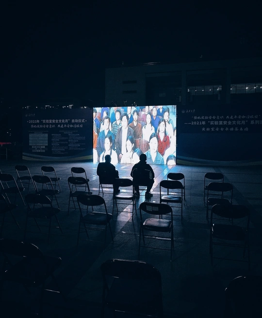 空旷的广场,整齐的座椅,两个孤独的背影; 明亮的荧幕,人满为患的电子荧幕... 屏幕里和屏幕外的两个世界正在对视,对比...