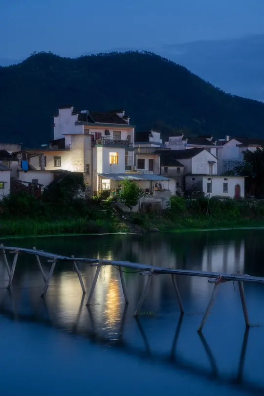 夜幕降临,天空呈现出美丽的蓝调,河对岸村庄的房屋,散发着点点暖光。我以当地特色的小木桥为前景,拍摄下了这一静谧美好的画面。