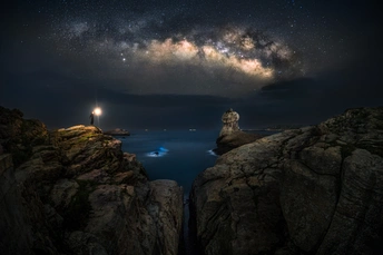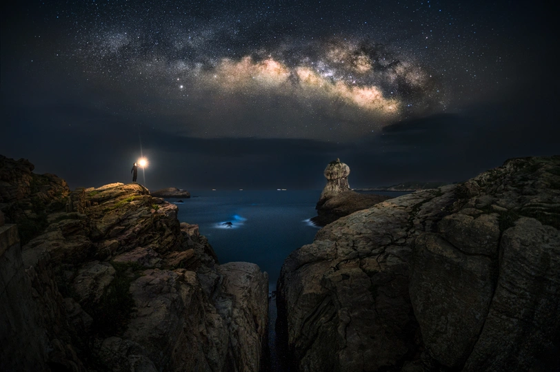 五一去台山岛拍银河,重装露营了两天两天整个晚上银河就露出来了30分钟不到,但是在岛上抓到水母,看见清澈无比的大海,还看见了蓝眼泪一线天+雨伞礁石+银河+微量蓝眼泪由Nikon Z 6+昇浪11mm f2.8 iso8000 25s堆栈十张+地景iso100 350s曝光后期合成