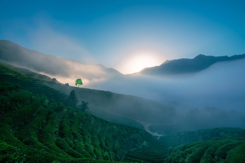 茶园雾色晨光