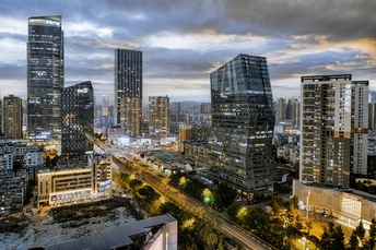 在黄昏的余晖中,城市的天际线被夕阳的余辉染成了一片金黄。高楼大厦矗立在这片繁华之中,它们的玻璃幕墙反射出天空的颜色,如同一面面巨大的镜子。街道上车流如织,灯光闪烁,仿佛城市的脉络在夜幕即将降临时更加活跃。远方的建筑群逐渐融入夜色,而近处的树木和建筑则被路灯点亮,形成鲜明的对比。