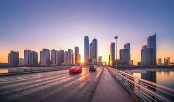 天津市滨海新区于家堡响螺湾CBD 车辆和建筑在日落下闪烁着光辉 希望天津发展越来越好吧