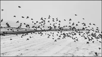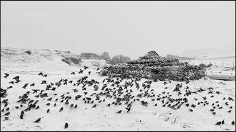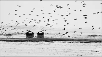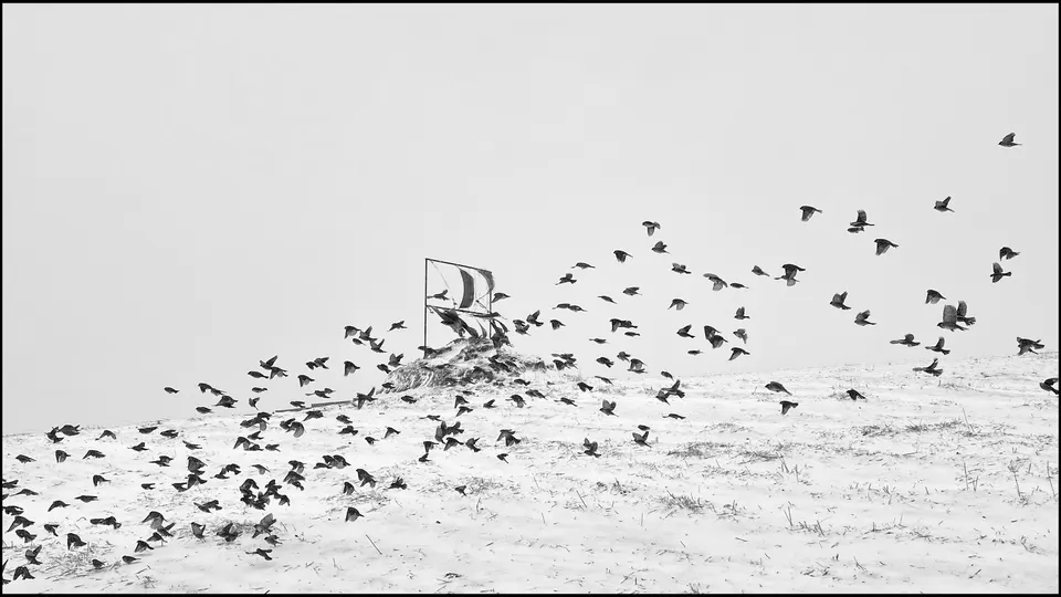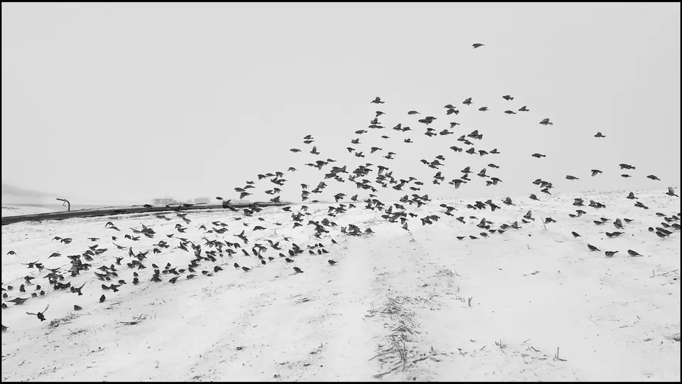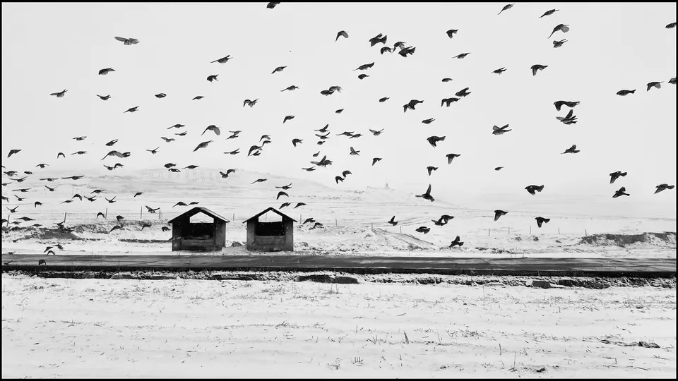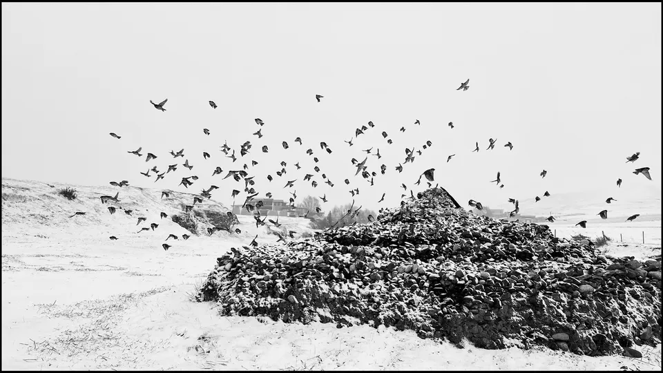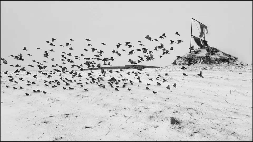 寂静雪野里的黑鸟。雪后,一片清净, “垃圾, 看不到了。 PUPU在 茅厕外地那些 💩 也不见了 踪影。 我 见过,很多 💩从,茅坑堆到 门口的 厕所,闻过 那种,浓郁地 味道。” 看到经幡,然后是雪地上的鸟群,忽儿落在地上,忽儿旋绕飞翔。四处延伸至远处,没有人影。 “I do not know which to prefer, The beauty of inflections Or the beauty of innuendoes, The blackbird whistling Or just after. 我不知如何取舍, 变调之美 抑或曲隐之美, 黑鸟啸鸣中, 抑或其后。 ” 喜欢雪野里钻进鼻孔的冰冷。听着鸟群飞起时翅膀扇动空气的声音,心里更加宁静。 图6,是居民倾倒垃圾的小房子🏠。