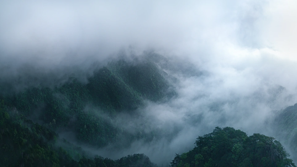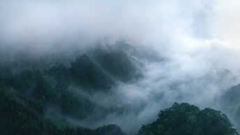 明月山云雾缭绕的山峦景象,绿意盎然的山林在迷雾中若隐若现,营造出神秘而宁静的氛围,画面细腻传神,仿佛带领观众进入一片自然的梦幻之境。