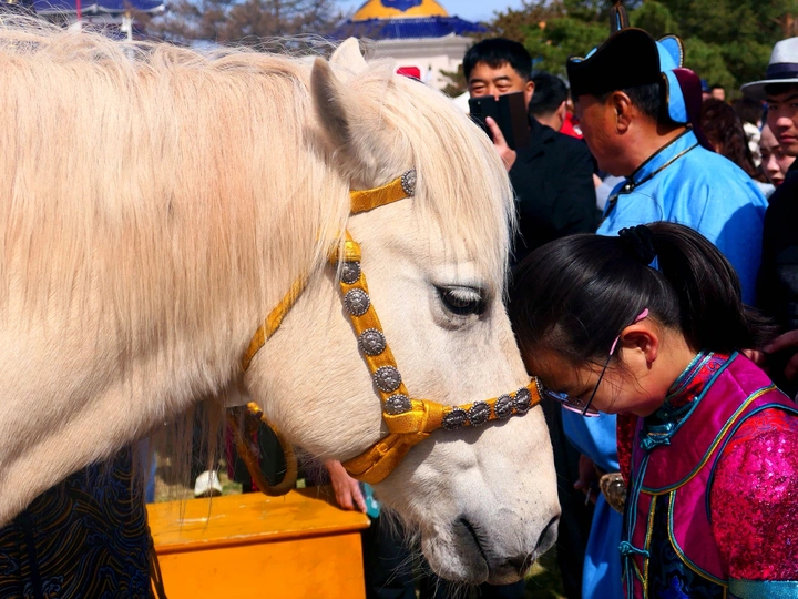 成吉思汗陵查干苏鲁克2024春季大典上,人们穿着节日的盛装,排着队朝拜“亲吻”成吉思汗的转世白神马。得到神马的“亲吻”,意味福祉和好运,寄托着蒙古族人对马对美好生活的一片深情。