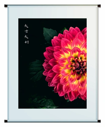 这幅图拍摄的是大丽花,花语寓意大吉大利。采用了开放式构图,背景压暗,后期增加中式卷轴画框,赋予了形式美。