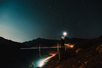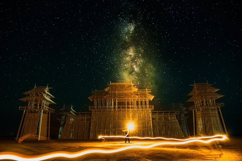 这组照片,拍摄于我独自一人驾车环游中国途中,包含甘肃无界雕塑,西藏阿里古格王朝遗址,新疆果子沟大桥。每一张照片都是经过提前数小时甚至一整天的踩点,半夜一人在戈壁滩上或者陡峭的山坡上拍摄数小时才完成。而这组照片最初的构思来源于多年前的一场梦境,梦境里独自一人在荒原中仰望星空,于是才有了将这些古代遗迹、现代建筑与广袤的星空融合在一起的构想,或者说是星空的指引让我完成了这组照片的创作。