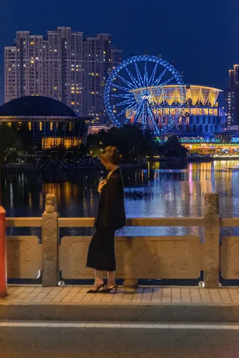 夜色下南京百家湖畔,美丽女子站在桥上看向远方,仿佛是在等待他的出现。。。。。。