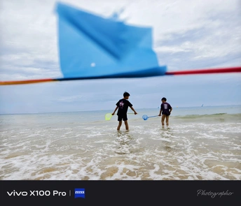 夏天的清凉,海水传递到你的肌肤,两个手抓捕捞网的少年,在海滩上扑腾着,又上又下,兴奋不已,水大好玩了。