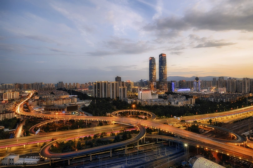 在黄昏的余晖中,城市的脉络官南立交桥如同一首未完成的交响乐,交织着红与蓝的乐章。摩天大楼万达双塔耸立于天际,犹如巨人般凝视着下方的繁华。蜿蜒的道路像是时间的河流,流淌着无数匆匆的脚步和梦想。@万诱引力