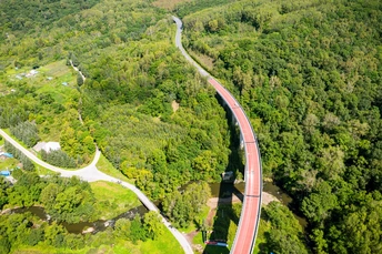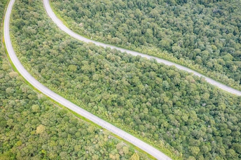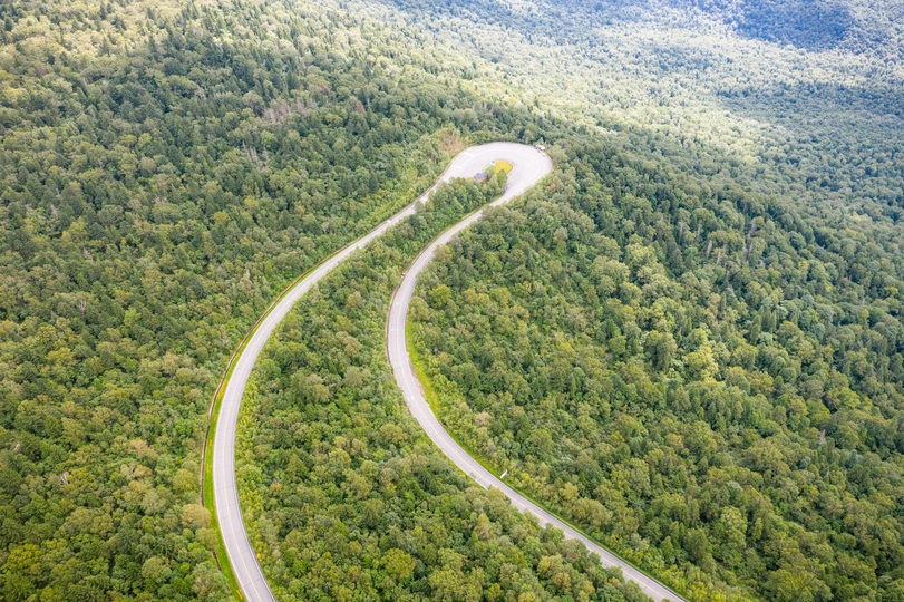 航拍穿越长白山脉原始森林中蜿蜒公路