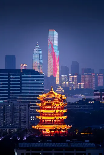 黄鹤楼与武汉天地、天悦外滩金融中心古今同框