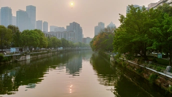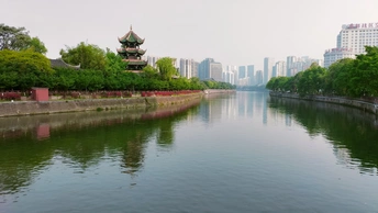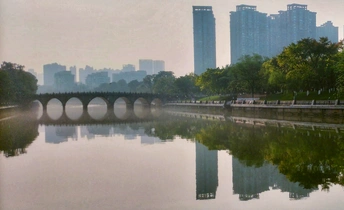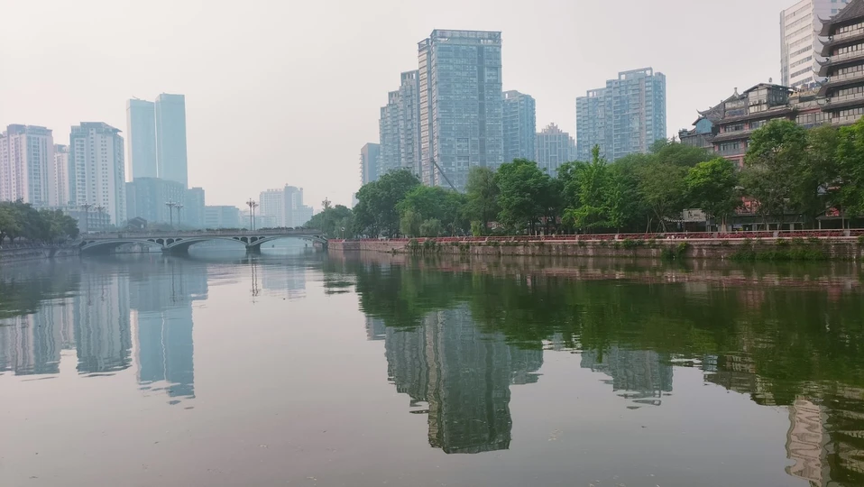 早晨七点钟,在府南河边。可以看见了的风景都很美丽。