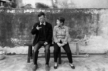一对老夫妻坐在凳子上。老太太聚精会神地听着老伴生动地侃侃而谈。