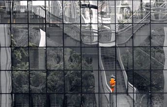 清晨上班路上,在地铁站外看见正在上楼梯的环卫工人,对着幕墙拍下此景。环卫工人橘黄色的外衣非常醒目,整个楼梯的形态也很有延伸感,远处的城市高楼在镜面反射中,创造出层次感和空间感。镜面中的画面有些扭曲,增加抽象美感。