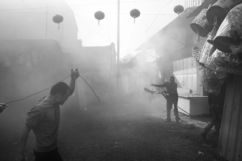 村里一年一度的游神赛会活动,人们放鞭炮迎接,增加节日气氛。