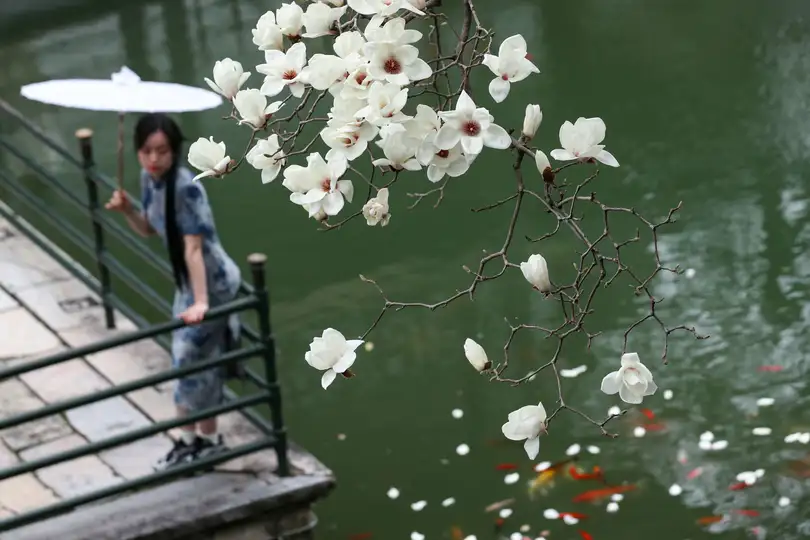 2024年3月17日,江苏省扬州市何园景区的网红玉兰绽放,把园林点缀得更加美丽,吸引游客身穿古装拍照。